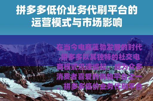 在当今电商蓬勃发展的时代,拼多多以其独特的社交电商模式迅速崛起,成为众多消费者喜爱的购物平台之一,拼多多低价业务代刷平台也悄然出现在市场的角落,引起了广泛的关注和讨论。