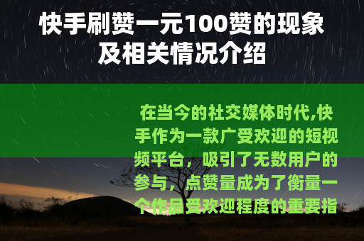 在当今的社交媒体时代,快手作为一款广受欢迎的短视频平台,吸引了无数用户的参与,点赞量成为了衡量一个作品受欢迎程度的重要指标之一,而在这个背景下,出现了一种所谓“快手刷赞一元100赞”的服务。
