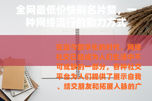 在当今数字化的时代,网络社交已经成为人们生活中不可或缺的一部分,各种社交平台为人们提供了展示自我、结交朋友和拓展人脉的广阔空间,而名片赞作为社交平台上一种常见的互动方式,也逐渐受到了众多用户的关注,全网最低价快刷名片赞的服务便应运而生,为许多希望在社交平台上获得更多关注和认可的用户提供了一种看似便捷的途径。