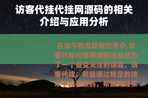 在当今的互联网世界中,访客代挂代挂网源码逐渐成为了一个备受关注的话题,访客代挂,就是通过特定的技术手段和源码,帮助网站实现访客数量的增加以及相关数据的优化,而代挂网源码则是实现这一功能的核心所在。