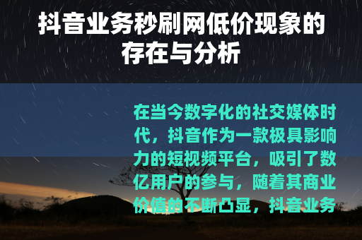 在当今数字化的社交媒体时代,抖音作为一款极具影响力的短视频平台,吸引了数亿用户的参与,随着其商业价值的不断凸显,抖音业务相关的各种服务和需求也应运而生,其中抖音业务秒刷网低价的现象逐渐进入了人们的视野。