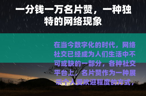 一分钱一万名片赞的现象是网络社交发展过程中的一个阶段性产物,它为我们提供了一个观察和思考网络社交的新视角,我们要从中吸取经验教训,不断完善自己的社交行为和方式,让网络社交更好地服务于我们的生活和成长。 对您有所帮助,您可以根据实际需求进行调整和修改,需要注意的是,在现实生活中,通过非正规途径购买名片赞等虚拟数据的行为可能违反相关平台规定,建议在合法合规的前提下进行社交活动。