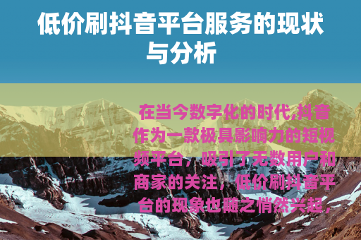 在当今数字化的时代,抖音作为一款极具影响力的短视频平台,吸引了无数用户和商家的关注,低价刷抖音平台的现象也随之悄然兴起。