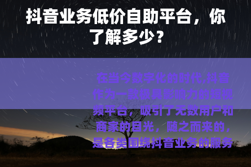 在当今数字化的时代,抖音作为一款极具影响力的短视频平台,吸引了无数用户和商家的目光,随之而来的,是各类围绕抖音业务的服务平台不断涌现,其中抖音业务低价自助平台备受关注。
