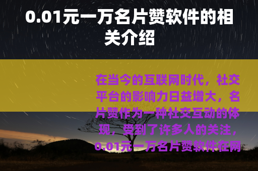 在当今的互联网时代,社交平台的影响力日益增大,名片赞作为一种社交互动的体现,受到了许多人的关注,0.01元一万名片赞软件在网络上引起了不小的轰动。