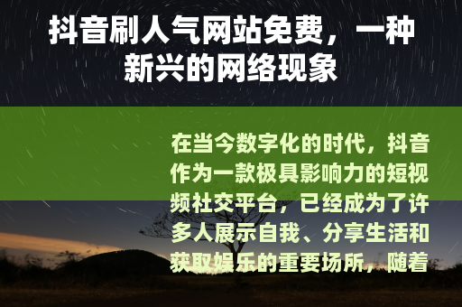 在当今数字化的时代,抖音作为一款极具影响力的短视频社交平台,已经成为了许多人展示自我、分享生活和获取娱乐的重要场所,随着其用户数量的不断增长和竞争的日益激烈,一种名为“抖音刷人气网站免费”的现象逐渐兴起,引起了众多用户的关注。