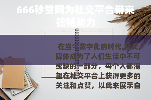 在当今数字化的时代,社交媒体成为了人们生活中不可或缺的一部分,每个人都渴望在社交平台上获得更多的关注和点赞,以此来展示自己的魅力和价值,而666秒赞网的出现,无疑为广大用户提供了一个新的途径,满足了他们在社交领域的特定需求。