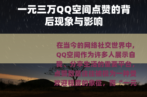 在当今的网络社交世界中,QQ空间作为许多人展示自我、分享生活的重要平台,点赞数量往往被视为一种受欢迎程度的象征,而“一元三万QQ空间点赞”这样的现象也随之悄然兴起,引发了一系列值得关注的话题。