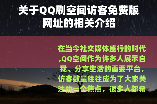 在当今社交媒体盛行的时代,QQ空间作为许多人展示自我、分享生活的重要平台,访客数量往往成为了大家关注的一个焦点,很多人都希望自己的空间能有更多的人访问,以增加人气和互动,一些声称可以提供QQ刷空间访客免费版网址的信息便应运而生。