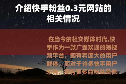 在当今的社交媒体时代,快手作为一款广受欢迎的短视频平台,拥有着庞大的用户群体,而对于许多快手用户来说,拥有更多的粉丝是他们所追求的目标之一,在这样的背景下,一些声称可以提供快手粉丝且价格低至0.3元的网站应运而生。