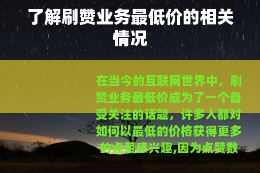 在当今的互联网世界中,刷赞业务最低价成为了一个备受关注的话题,许多人都对如何以最低的价格获得更多的点赞感兴趣,因为点赞数量在一定程度上代表着受欢迎程度和影响力。