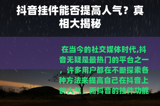 在当今的社交媒体时代,抖音无疑是最热门的平台之一,许多用户都在不断探索各种方法来提高自己在抖音上的人气,而抖音的挂件功能也引起了众多人的关注,抖音的挂件真的能提高人气吗?