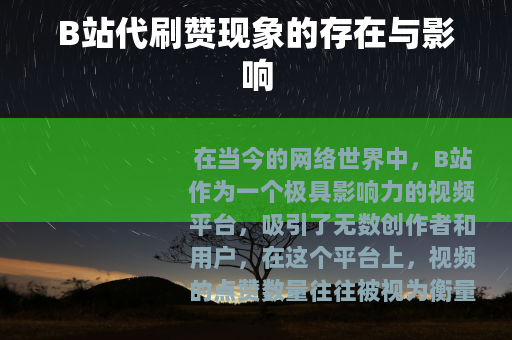 在当今的网络世界中,B站作为一个极具影响力的视频平台,吸引了无数创作者和用户,在这个平台上,视频的点赞数量往往被视为衡量其受欢迎程度和质量的一个重要指标,而随之而来的,便是B站代刷赞这一现象的悄然兴起。