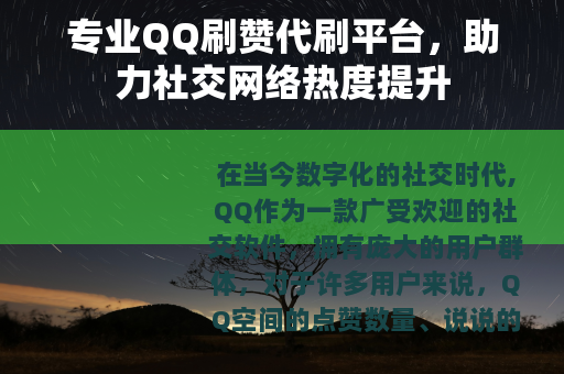在当今数字化的社交时代,QQ作为一款广受欢迎的社交软件,拥有庞大的用户群体,对于许多用户来说,QQ空间的点赞数量、说说的热度等都成为了衡量自己在社交网络中受欢迎程度的一个重要指标,而专业QQ刷赞代刷平台便应运而生,为用户提供了一种快速提升QQ相关数据热度的途径。