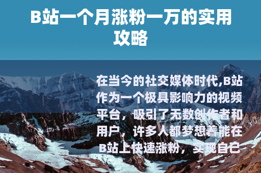 在当今的社交媒体时代,B站作为一个极具影响力的视频平台,吸引了无数创作者和用户,许多人都梦想着能在B站上快速涨粉,实现自己的创作价值和影响力,我们就来分享一些在B站一个月涨粉一万的有效方法。 创作是关键,要想吸引粉丝,就必须提供有价值、有趣、有特色的视频内容,了解目标受众的兴趣和需求,选择一个自己擅长且有市场的领域进行深耕,如果你擅长游戏,那么可以制作精彩的游戏攻略、搞笑的游戏实况等视频;如果你对美食有研究,美食制作、探店等类型的视频会是不错的选择,通过持续输出高质量的内容,让观众在你的视频中能获得快乐、知识或启发,这样他们就会更愿意关注你,成为你的粉丝。