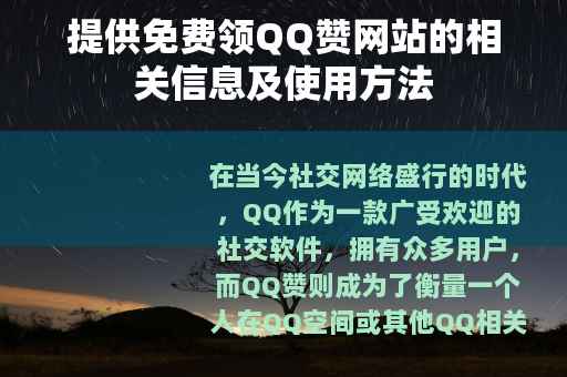 在当今社交网络盛行的时代,QQ作为一款广受欢迎的社交软件,拥有众多用户,而QQ赞则成为了衡量一个人在QQ空间或其他QQ相关社交场景中受欢迎程度的一个重要指标,许多人都希望自己的动态、说说等能获得更多的赞,以展示自己的人气和魅力,免费领QQ赞的网站便应运而生,为广大QQ用户提供了一个获取更多赞的途径。
