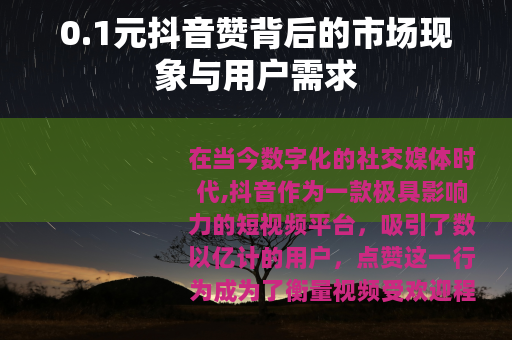 在当今数字化的社交媒体时代,抖音作为一款极具影响力的短视频平台,吸引了数以亿计的用户,点赞这一行为成为了衡量视频受欢迎程度的重要指标之一,而市场上出现的0.1元抖音赞的现象,也引发了广泛的关注和讨论。