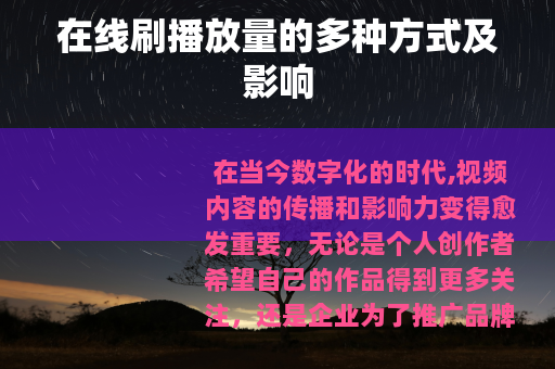 在当今数字化的时代,视频内容的传播和影响力变得愈发重要,无论是个人创作者希望自己的作品得到更多关注,还是企业为了推广品牌和产品而制作的宣传视频,播放量都成为了衡量其成功与否的一个重要指标,在线刷播放量的现象也随之出现,并且呈现出多样化的发展态势。