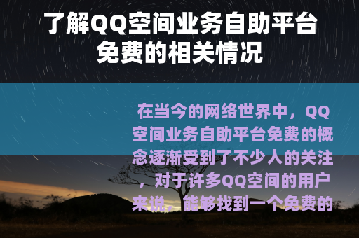 在当今的网络世界中,QQ空间业务自助平台免费的概念逐渐受到了不少人的关注,对于许多QQ空间的用户来说,能够找到一个免费的自助平台来提升自己空间的各种业务,无疑是一件具有吸引力的事情。