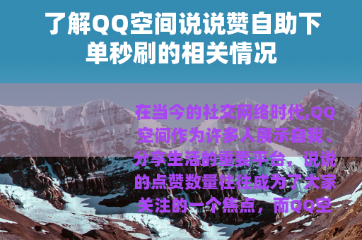 在当今的社交网络时代,QQ空间作为许多人展示自我、分享生活的重要平台,说说的点赞数量往往成为了大家关注的一个焦点,而QQ空间说说赞自助下单秒刷服务也随之应运而生,为不少用户提供了一种快速增加说说点赞数的途径。