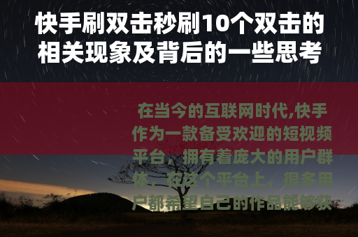 在当今的互联网时代,快手作为一款备受欢迎的短视频平台,拥有着庞大的用户群体,在这个平台上,很多用户都希望自己的作品能够获得更多的关注和双击,也就是点赞,而“快手刷双击秒刷10个双击”这样的现象也随之出现。