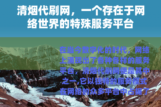 在当今数字化的时代,网络上涌现出了各种各样的服务平台,清烟代刷网便是其中之一,它以独特的服务模式在网络的众多平台中占据了一席之地。