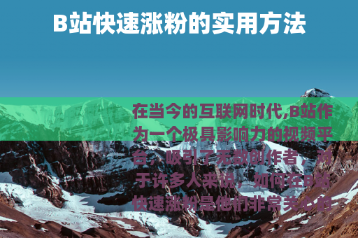 在当今的互联网时代,B站作为一个极具影响力的视频平台,吸引了无数创作者,对于许多人来说,如何在B站快速涨粉是他们非常关心的问题,以下是一些在B站快速涨粉的有效途径。 质量是关键,要确保你的视频具有独特性和吸引力,深入了解你的目标受众,制作出他们感兴趣的内容,无论是有趣的搞笑视频、专业的知识讲解,还是精彩的游戏攻略,都要在内容上做到精益求精,投入足够的时间和精力去策划、拍摄和剪辑,让你的视频在众多作品中脱颖而出。