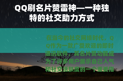 QQ刷名片赞雷神以其高效、便捷的特点,吸引了大量QQ用户的关注,它就像是一个神奇的社交助力工具,能够在短时间内让用户的名片赞数量大幅增加,对于那些渴望在QQ社交圈中获得更多关注和认可的用户来说,这无疑是一个极具吸引力的选择。
