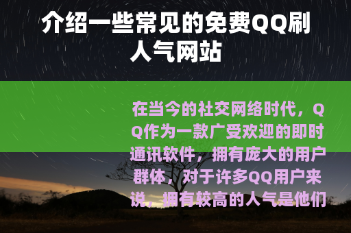 在当今的社交网络时代,QQ作为一款广受欢迎的即时通讯软件,拥有庞大的用户群体,对于许多QQ用户来说,拥有较高的人气是他们所期望的,这不仅可以让自己的空间或账号更受关注,也能在一定程度上满足自己的社交需求,不少人会去寻找一些免费的QQ刷人气网站。