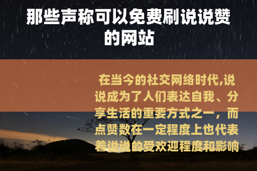 在当今的社交网络时代,说说成为了人们表达自我、分享生活的重要方式之一,而点赞数在一定程度上也代表着说说的受欢迎程度和影响力,一些声称可以免费刷说说赞的网站应运而生,吸引了不少人的关注。