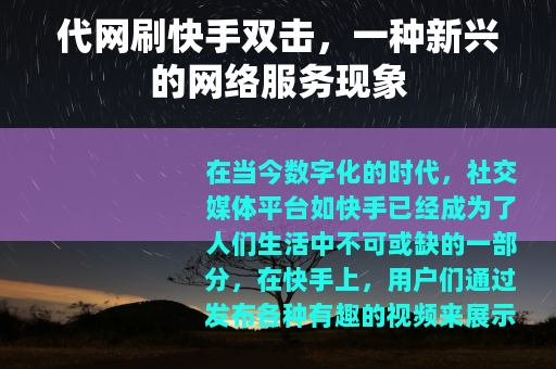 在当今数字化的时代,社交媒体平台如快手已经成为了人们生活中不可或缺的一部分,在快手上,用户们通过发布各种有趣的视频来展示自己的才华、生活点滴或创意想法,希望能够获得更多的关注和双击点赞,而随着这种需求的增长,一种名为代网刷快手双击的服务也应运而生。