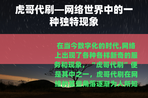 在当今数字化的时代,网络上出现了各种各样新奇的服务和现象,“虎哥代刷”便是其中之一,虎哥代刷在网络的某些角落逐渐为人所知,它以一种独特的方式满足着一部分人的需求。