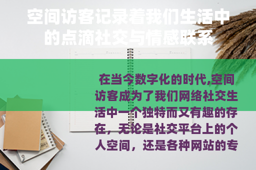 在当今数字化的时代,空间访客成为了我们网络社交生活中一个独特而又有趣的存在,无论是社交平台上的个人空间,还是各种网站的专属区域,访客的足迹都如同岁月的痕迹,诉说着人与人之间的互动与故事。