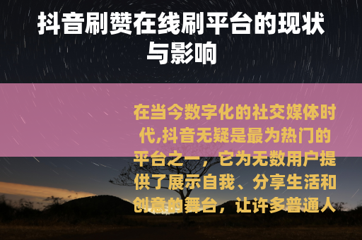 在当今数字化的社交媒体时代,抖音无疑是最为热门的平台之一,它为无数用户提供了展示自我、分享生活和创意的舞台,让许多普通人有机会一夜成名,成为网络上的焦点,而在抖音的生态中,点赞数成为了衡量一个视频受欢迎程度的重要指标之一,抖音刷赞在线刷平台应运而生。