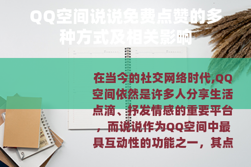 QQ空间说说免费点赞是一个具有两面性的现象,它既为用户提供了一种增加说说热度、满足社交需求的途径,又可能引发一些诸如内容质量下降、过度依赖等问题,但只要我们能够正确地认识和利用它,就可以在享受免费点赞带来的好处的同时,保持QQ空间社交的健康和活力,让这个平台继续成为我们展示自我、交流情感、分享生活的美好空间,我们应该在追求点赞数量的同时,更加注重说说内容的质量和社交关系的维护,以积极的态度和正确的方法,在QQ空间中创造出更加丰富和有意义的社交体验。