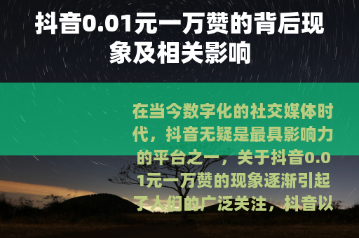 在当今数字化的社交媒体时代,抖音无疑是最具影响力的平台之一,关于抖音0.01元一万赞的现象逐渐引起了人们的广泛关注。
