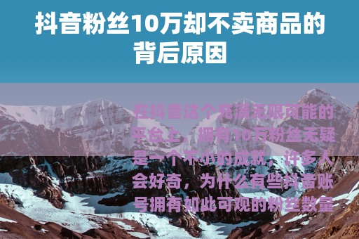 在抖音这个充满无限可能的平台上,拥有10万粉丝无疑是一个不小的成就,许多人会好奇,为什么有些抖音账号拥有如此可观的粉丝数量,却迟迟不见其卖商品呢?这背后其实有着多方面的原因。