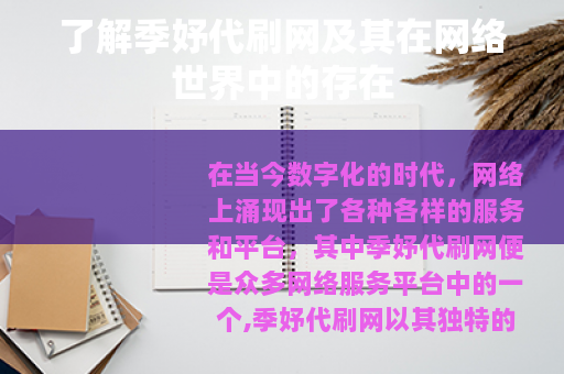 在当今数字化的时代,网络上涌现出了各种各样的服务和平台,其中季妤代刷网便是众多网络服务平台中的一个,季妤代刷网以其独特的服务内容在一定的网络群体中受到了关注。
