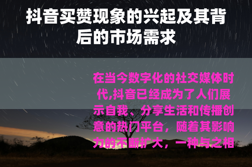 在当今数字化的社交媒体时代,抖音已经成为了人们展示自我、分享生活和传播创意的热门平台,随着其影响力的不断扩大,一种与之相关的现象——买赞抖音赞也逐渐进入了大众的视野。