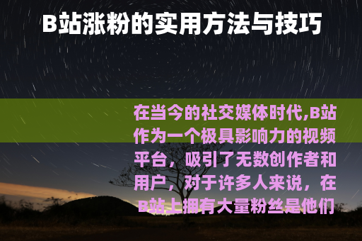 在当今的社交媒体时代,B站作为一个极具影响力的视频平台,吸引了无数创作者和用户,对于许多人来说,在B站上拥有大量粉丝是他们的目标之一,那么B站怎么涨粉丝呢?以下是一些实用的方法和技巧。 质量是关键,要制作出高质量、有吸引力的视频内容,这意味着你需要有独特的创意和想法,能够提供给观众有价值的信息或娱乐,无论是搞笑、知识科普、美食制作还是游戏攻略等各种类型的视频,都要确保在内容上做到精益求精,如果你是做知识科普类视频的,要确保你的讲解准确、清晰,并且能够用生动有趣的方式呈现,让观众易于理解和接受。