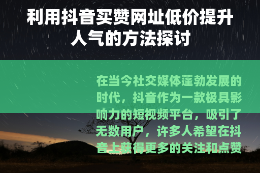 在当今社交媒体蓬勃发展的时代,抖音作为一款极具影响力的短视频平台,吸引了无数用户,许多人希望在抖音上获得更多的关注和点赞,以提升自己的人气和影响力,而抖音买赞网址低价这一现象也随之出现,为不少用户提供了一种看似便捷的途径来增加自己作品的点赞数。