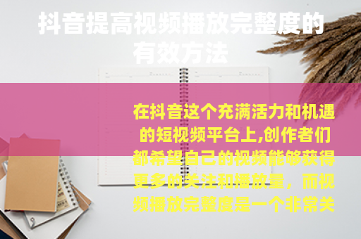 在抖音这个充满活力和机遇的短视频平台上,创作者们都希望自己的视频能够获得更多的关注和播放量,而视频播放完整度是一个非常关键的指标,如何提高抖音视频的播放完整度呢?以下是一些实用的方法。 的吸引力至关重要,要确保视频的开头能够迅速抓住用户的眼球,可以通过设置一个有趣的悬念、提出一个引人深思的问题或者展示一个令人惊叹的场景等方式,激发用户的好奇心,让他们想要继续看下去,在美食视频的开头,可以展示一道精美的成品菜肴,然后再逐步介绍制作过程,这样用户就会更有兴趣观看完整视频,了解这道美食是如何制作出来的。