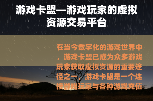 在当今数字化的游戏世界中,游戏卡盟已成为众多游戏玩家获取虚拟资源的重要途径之一,游戏卡盟是一个连接游戏玩家与各种游戏充值卡、道具、账号等资源的交易平台,为玩家们提供了丰富多样的选择。
