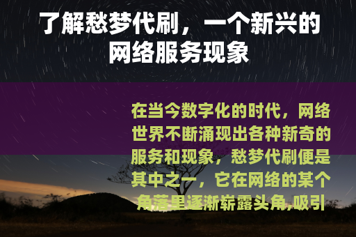 在当今数字化的时代,网络世界不断涌现出各种新奇的服务和现象,愁梦代刷便是其中之一,它在网络的某个角落里逐渐崭露头角,吸引了不少人的关注。