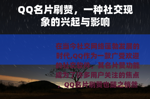在当今社交网络蓬勃发展的时代,QQ作为一款广受欢迎的社交软件,其名片赞功能成为了许多用户关注的焦点,QQ名片刷赞也随之悄然兴起,成为了一种独特的社交现象,在一定程度上影响着用户的社交体验和网络社交生态。