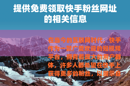 在当今的互联网时代,快手作为一款广受欢迎的短视频平台,拥有着庞大的用户群体,许多人都希望在快手上获得更多的粉丝,以展示自己的才华或推广自己的产品和服务,而免费领取快手粉丝网址的出现,为一些用户提供了一种可能的途径。