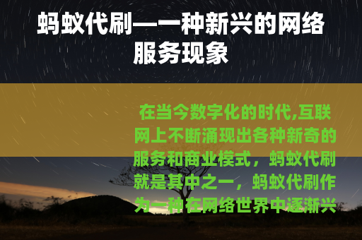 在当今数字化的时代,互联网上不断涌现出各种新奇的服务和商业模式,蚂蚁代刷就是其中之一,蚂蚁代刷作为一种在网络世界中逐渐兴起的服务,吸引了不少人的关注。