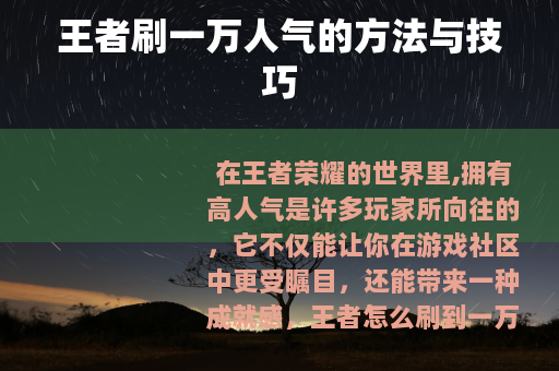 在王者荣耀的世界里,拥有高人气是许多玩家所向往的,它不仅能让你在游戏社区中更受瞩目,还能带来一种成就感,王者怎么刷到一万人气呢?以下是一些可行的方法和技巧。