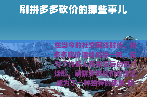 在互联网时代,刷拼多多砍价是一种顺应时代潮流的消费和社交方式,它将社交与消费紧密结合,为人们带来了全新的体验,我们应该以积极的态度看待这种现象,充分利用其优势,让它为我们的生活和社会发展服务,我们也希望拼多多能够继续创新和完善砍价活动,为用户提供更加优质的服务和更多的实惠,让刷拼多多砍价活动能够持续健康地发展下去,为我们的生活增添更多的美好和乐趣。