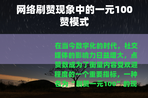 “刷赞一元100”现象是网络时代发展过程中出现的一种特殊现象,它既反映了人们对网络影响力的追求,也暴露了一些网络生态中的问题,我们需要在追求发展和进步的同时,注重维护网络环境的真实性和公正性,让网络世界更加美好。